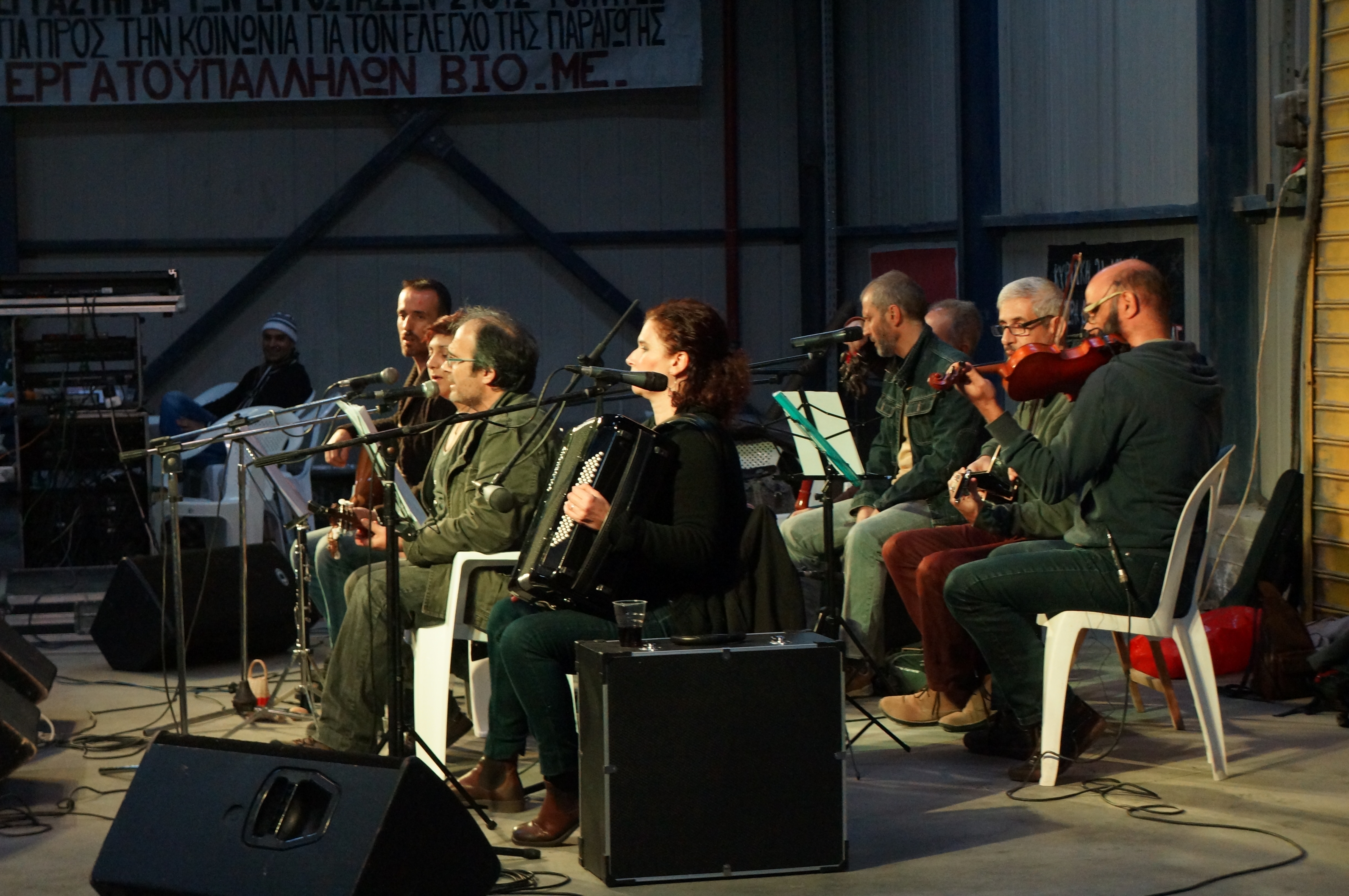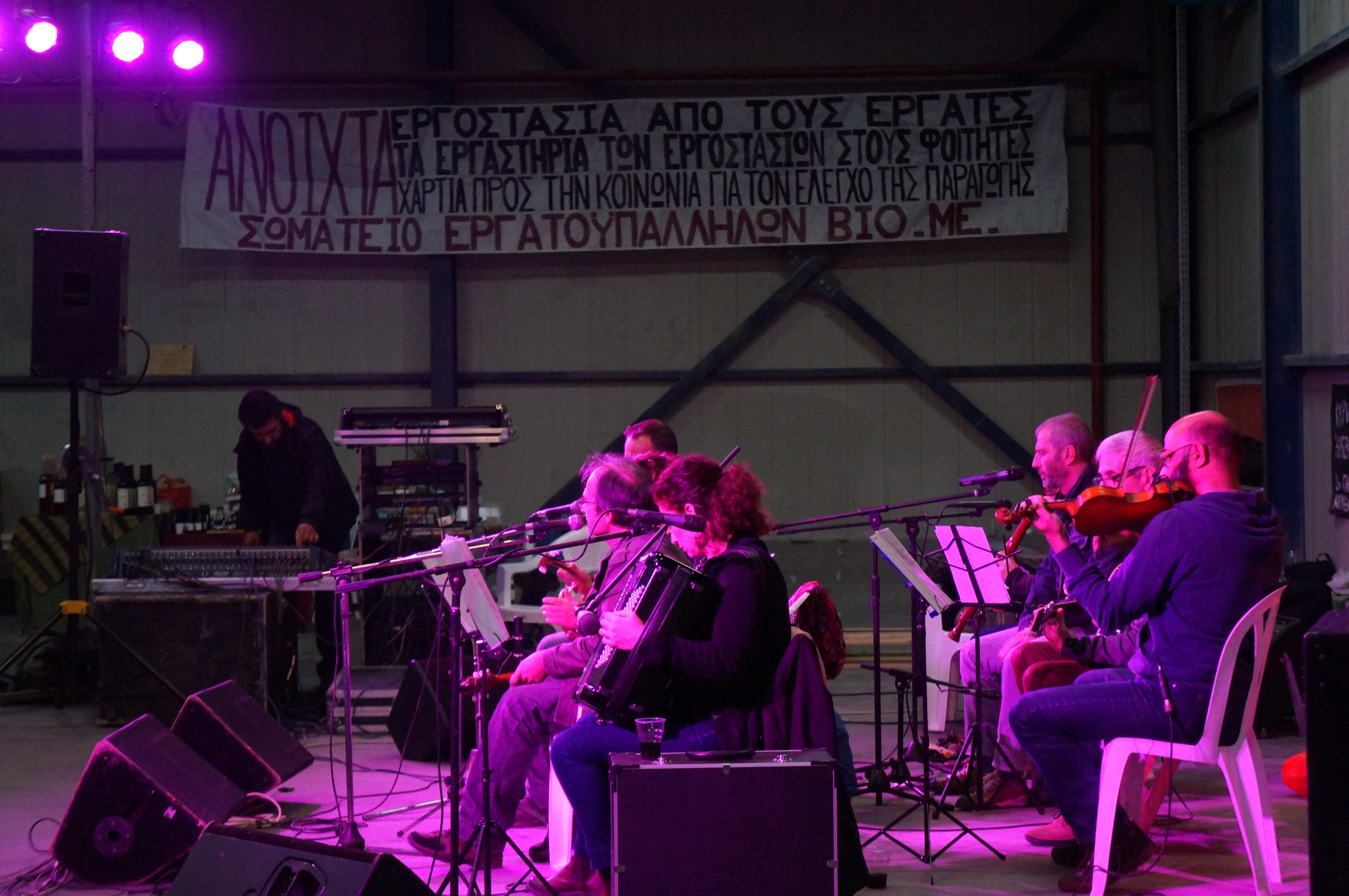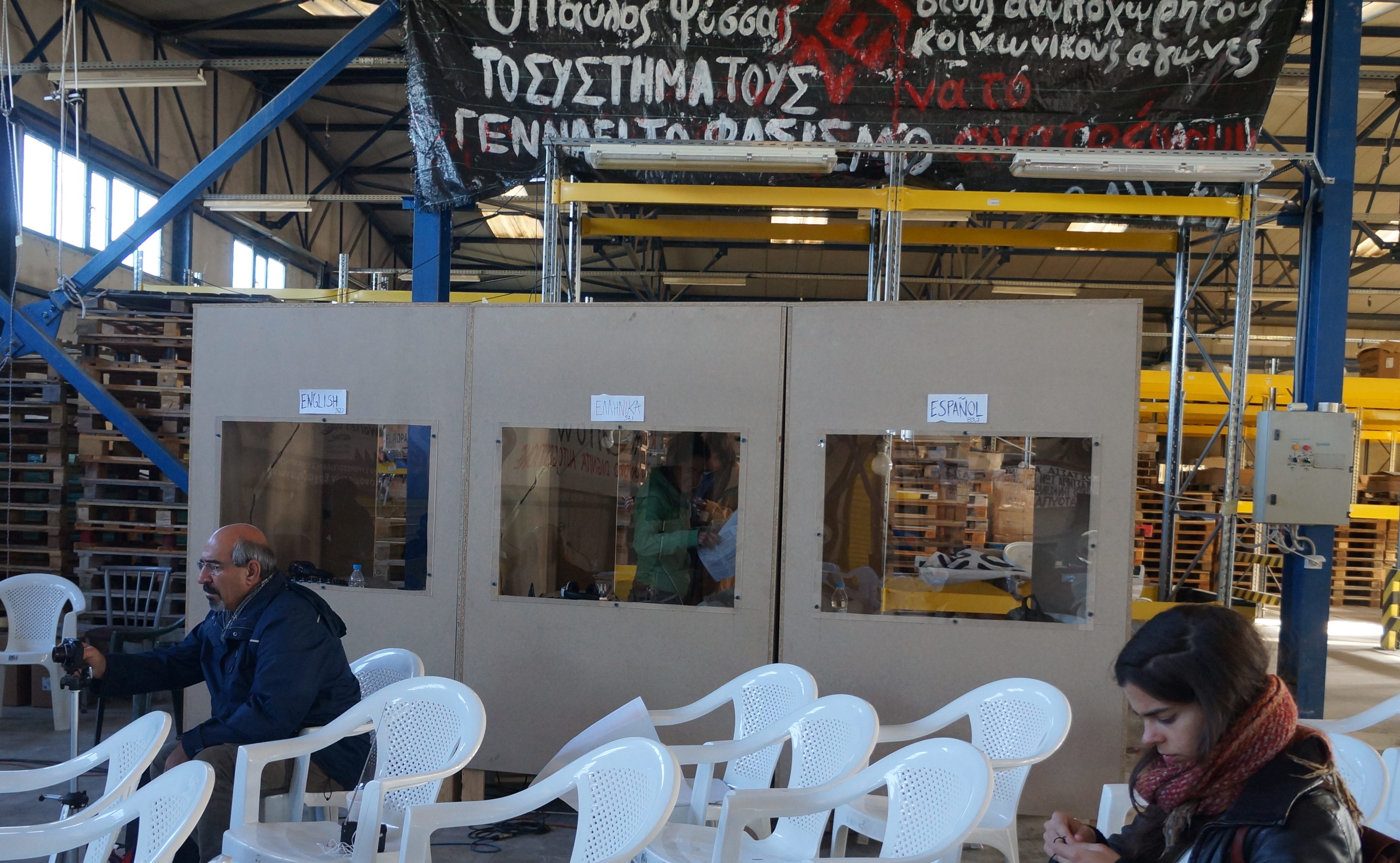 DSC05921Was VIO.ME betrifft, so war die Vielfalt und Größe der Unterstützerszene während der Tagung unmittelbar spürbar. Ca. 300 Teilnehmer*innen mussten über drei Tage mit Essen und Getränken versorgt, Technik musste bereitgestellt und funktionstüchtig gehalten werden. Angesichts der internationalen Zusammensetzung war ein großer Dolmetscherstab zu organisieren, der alles in die Konferenzsprachen Griechisch, Englisch und DSC05992Spanisch übersetzte. Außerdem gab es musikalische Darbietungen, die Vorführung eines Dokumentarfilms über VIO.ME, Stände mit regionalen Produkten und vieles mehr.