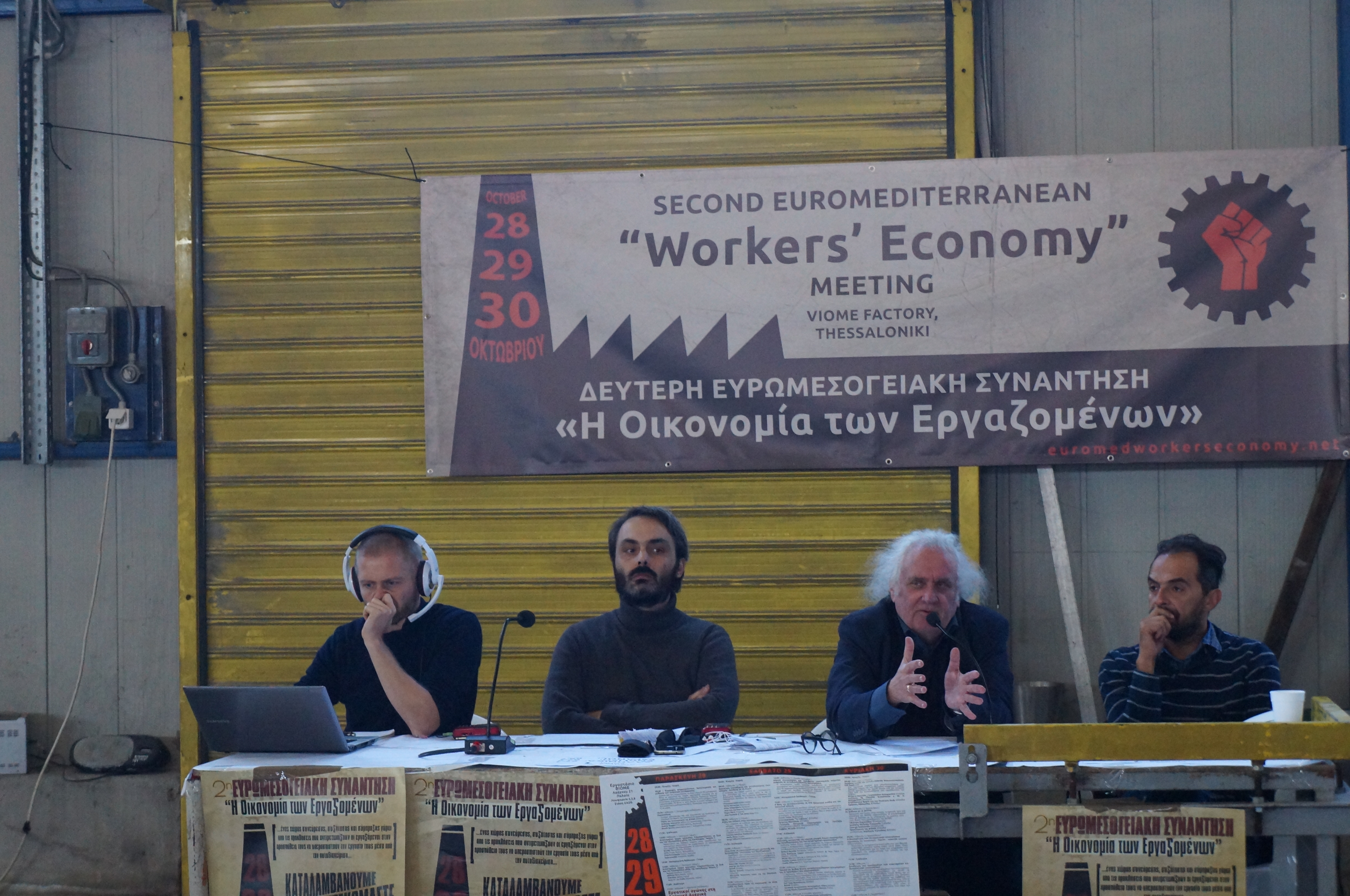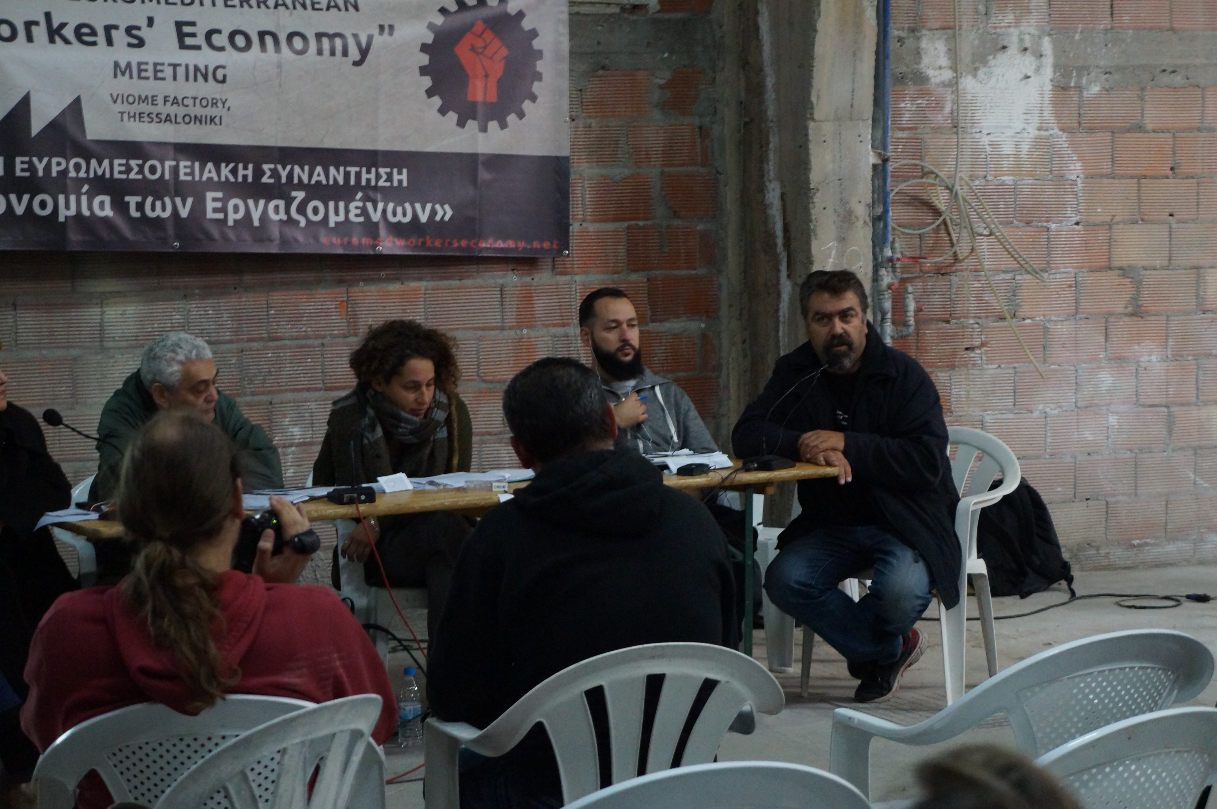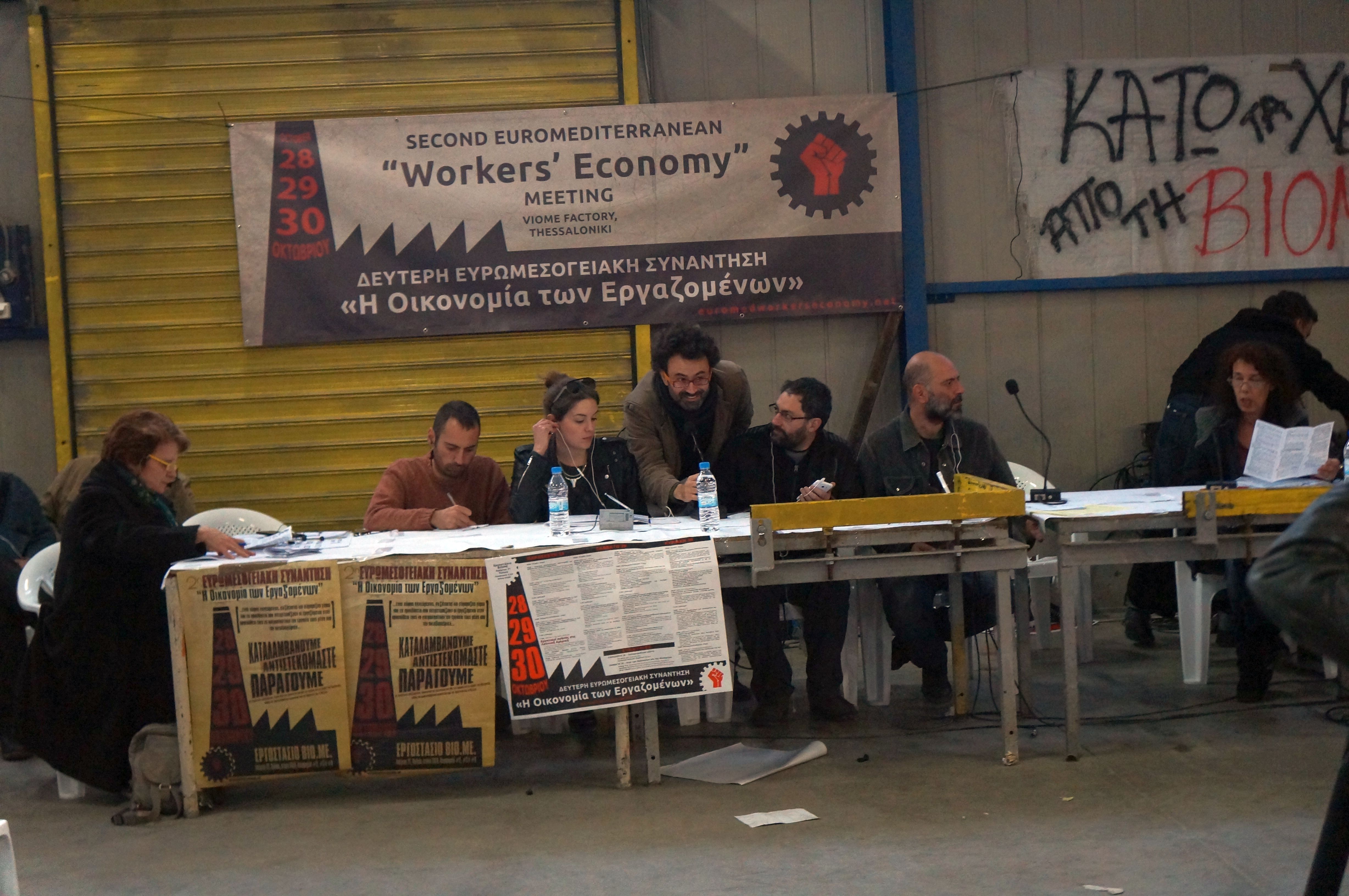 DSC06003Das erste Euromediterranean „Workers Economy“ Meeting fand 2014 in der damals noch besetzten, jetzt den Arbeitern übergebenen Teefabrik SCOP-TI (früher Fralib) in der Nähe von Marseille statt.Ging es damals um die ersten Kontakte und Informationen über die beteiligten Projekte, konnte bei diesem 2. Treffen in Thessaloniki eine breitere Information, Unterstützung und Zusammenarbeit besprochen werden. So gehörten zu den vertretenen Betrieben, Projekten und Initiativen neben den SCOP-TI-Kollegen, den italienischen Vertretern von officine zero aus Rom und Rimaflow aus Mailand, den VIO.ME-Kollegen aus Thessaloniki und spanischen Vertretern der CNT und Solidaridad Obrera weiterhin neue Vertreter von DITA aus Tuzla in Bosnien, von Jugoremedja aus Zrenjanin in Serbien, ITAS-Prvomajska aus Ivanec in Kroatien, Kazova aus Istanbul in der Türkei und der Social Cooperativa „Margin“ aus Polen.