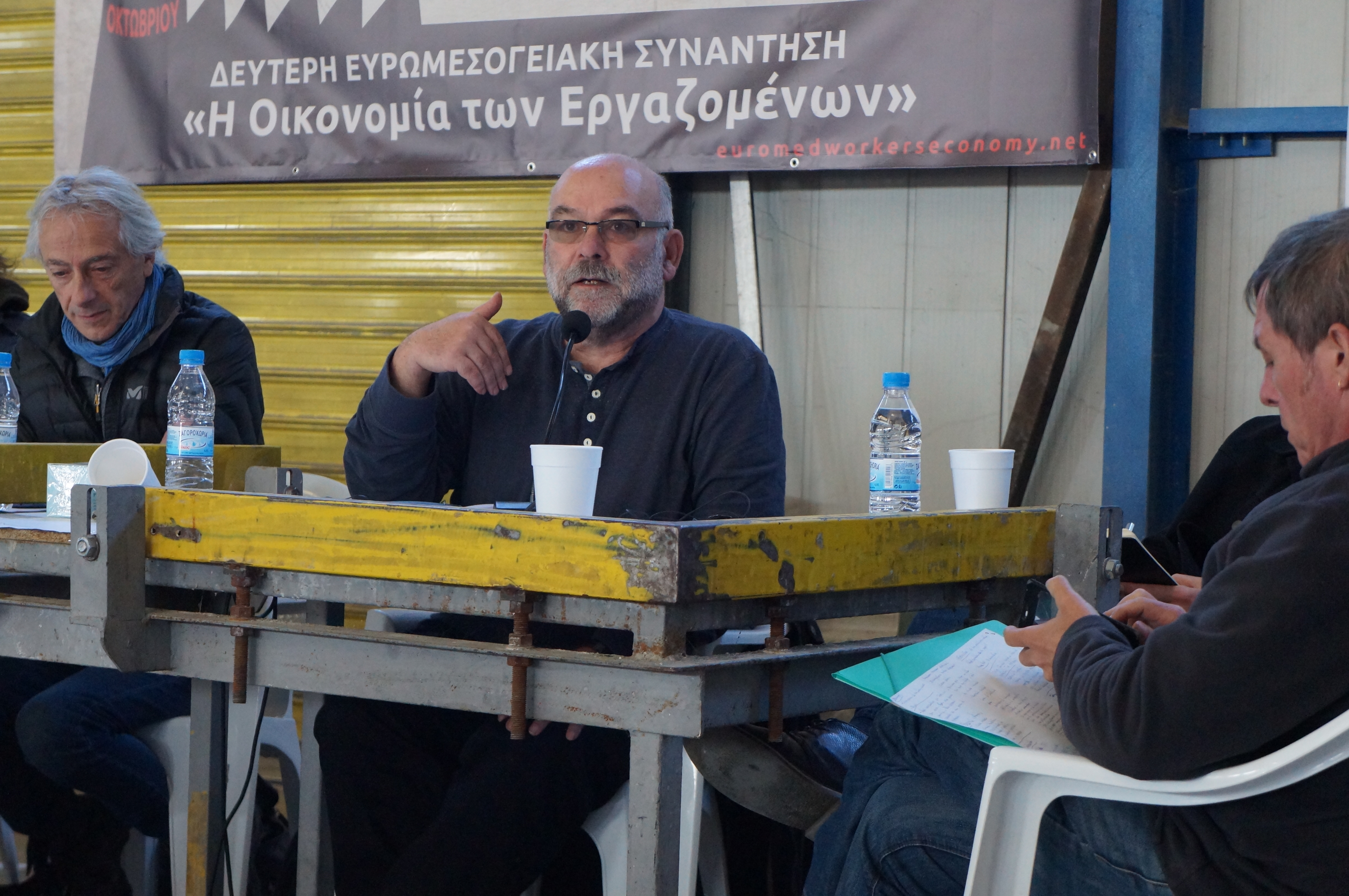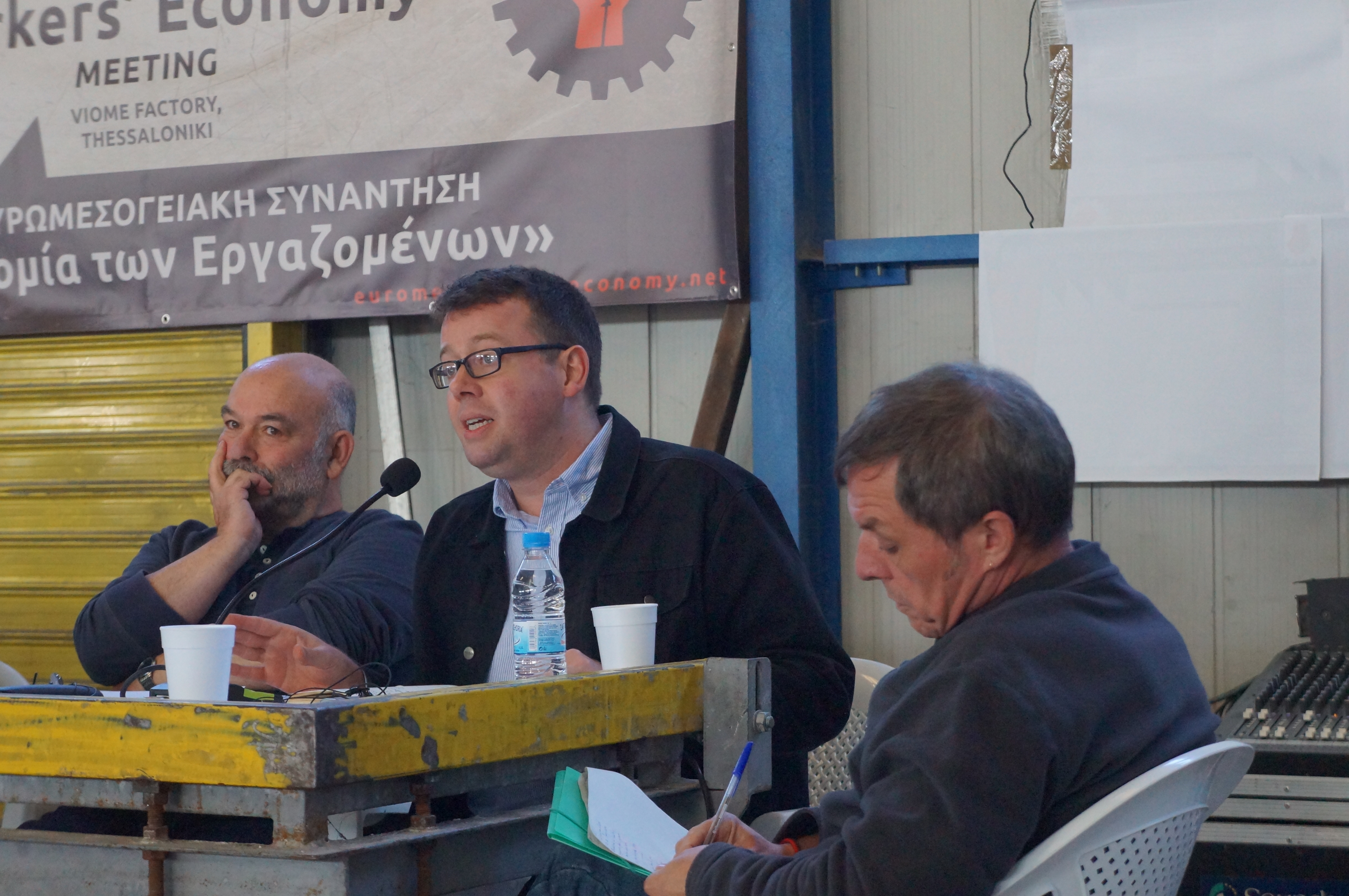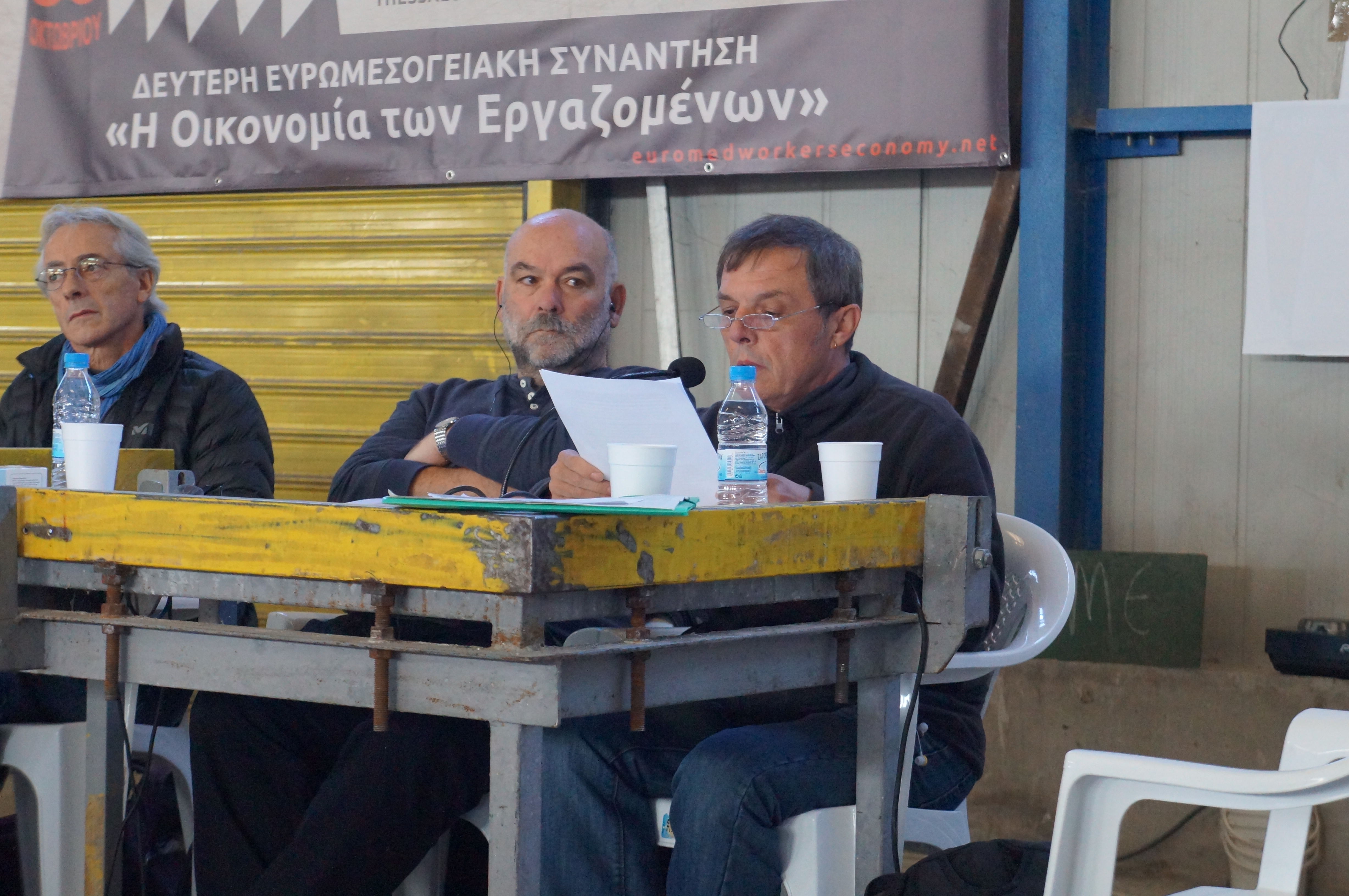 DSC06003Das erste Euromediterranean „Workers Economy“ Meeting fand 2014 in der damals noch besetzten, jetzt den Arbeitern übergebenen Teefabrik SCOP-TI (früher Fralib) in der Nähe von Marseille statt.Ging es damals um die ersten Kontakte und Informationen über die beteiligten Projekte, konnte bei diesem 2. Treffen in Thessaloniki eine breitere Information, Unterstützung und Zusammenarbeit besprochen werden. So gehörten zu den vertretenen Betrieben, Projekten und Initiativen neben den SCOP-TI-Kollegen, den italienischen Vertretern von officine zero aus Rom und Rimaflow aus Mailand, den VIO.ME-Kollegen aus Thessaloniki und spanischen Vertretern der CNT und Solidaridad Obrera weiterhin neue Vertreter von DITA aus Tuzla in Bosnien, von Jugoremedja aus Zrenjanin in Serbien, ITAS-Prvomajska aus Ivanec in Kroatien, Kazova aus Istanbul in der Türkei und der Social Cooperativa „Margin“ aus Polen.